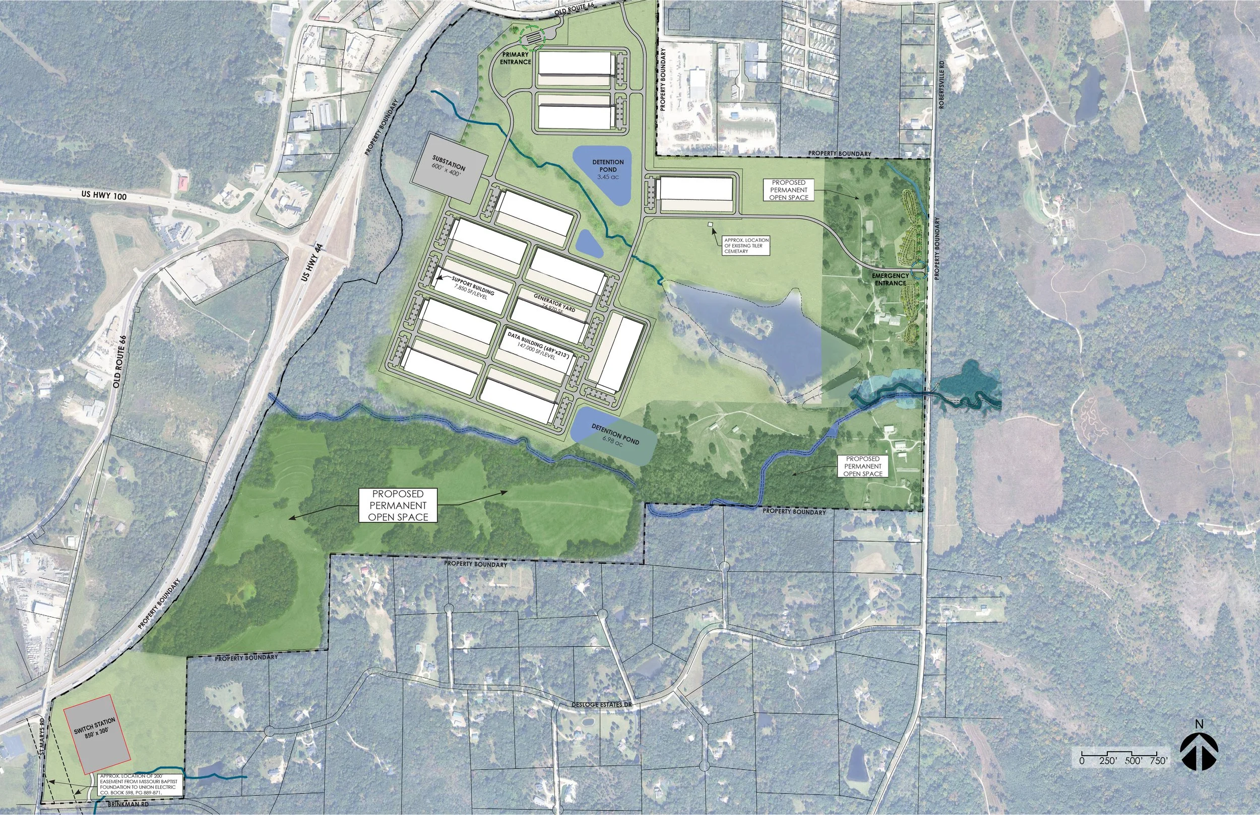 Gateway is a proposed data center campus located at the intersection of MO 100 and I-44. Designed as a low-impact alternative to high-density development, the 13-building plan preserves over 50% of the site as undisturbed green space and establishes 1,000-foot residential setbacks - more than double the industry standard. This application is currently undergoing a formal technical review by Franklin County’s professional consultants and the Franklin County Board of Commissioners.